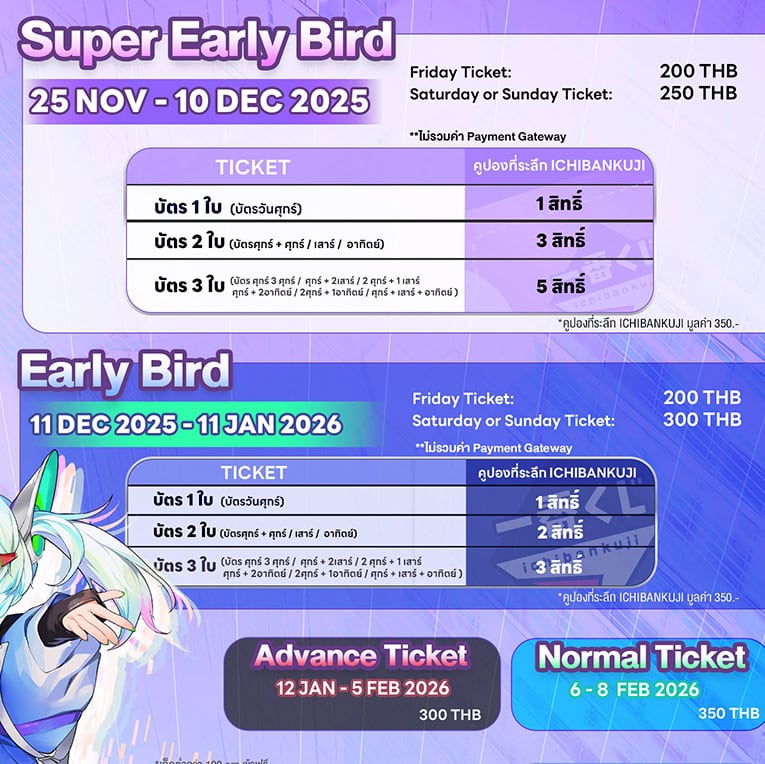 บัตร Super Early Bird กับ บัตร Early Bird สามารถมีสิทธิ์ร่วมจับอิจิบังคุจิ ส่วนบัตร Advance Ticket กับ บัตร Normal Ticket จะไม่มีสิทธิ์จับอิจิบังคุจิ